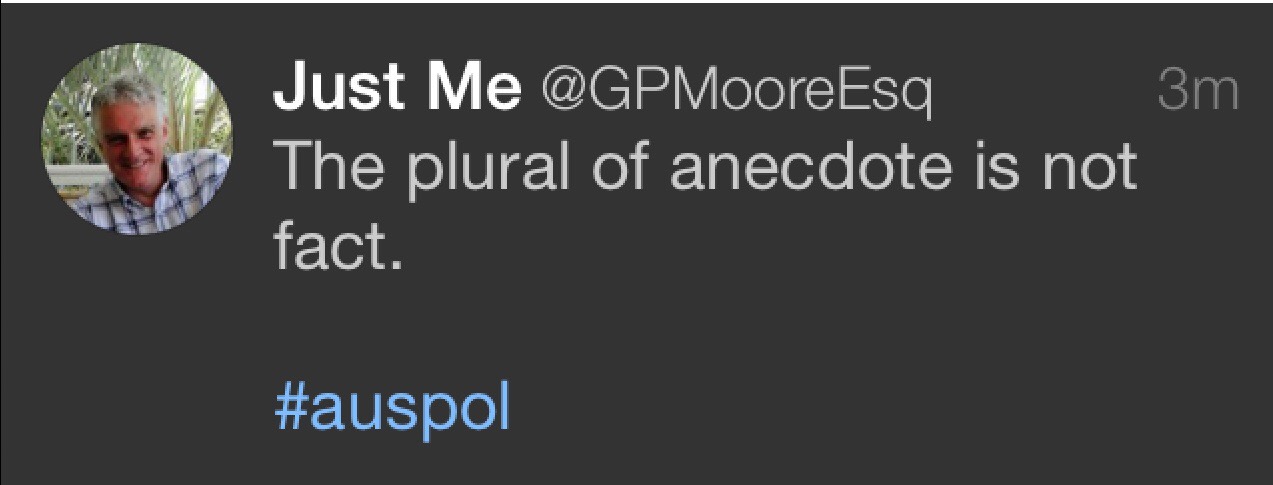Abetz followed the quote with his strong belief that “anyone who asserts a capacity to determine and divine the truth and facts in all matters should by definition be treated sceptically – especially when it impacts on our democratic processes”. Which, logically extended, would seem to not only serve as a rejection of ABC’s Fact Check, but the whole project of journalism itself – and much of politics.
